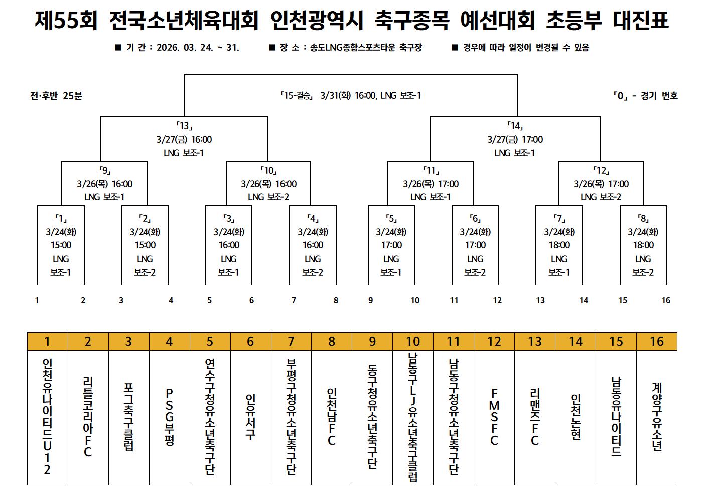 - 초등부 ■ 3월 24일 경기 결과 「1」인천유나이티드U12 2 (1 PSO 3) 2 리틀코리아FC 「2」포그축구클럽 0 : 3 PSG부평 「3」연수구청유소년축구단 3 : 2 인유서구 「4」부평구청유소년축구단 4 : 1 인천남FC 「5」동구청유소년축구단 1 : 5 남동구LJ유소년축구클럽 「6」남동구청유소년축구단 3 : 2 FMSFC 「7」리맨즈FC 1 : 0 인천논현 「8」남동유나이티드 2 : 7 계양구유소년 ■ 3월 26일 경기 결과 「9」리틀코리아FC 5 : 0 PSG부평 「10」연수구청유소년축구단 1 (2 PSO 3) 1 부평구청유소년축구단 「11」남동구LJ유소년축구클럽 1 (2 PSO 1) 1 남동구청유소년축구단 「12」리맨즈FC 2 : 1 계양구유소년