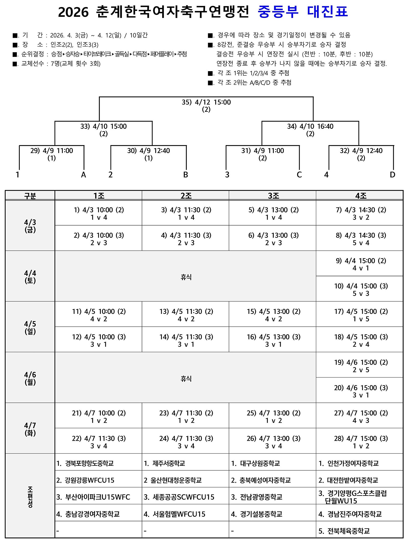참가 팀 : 부평동중, 청학중, 하나FCU15, JMPFCU15