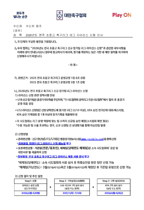 [전문] 2026년도 전국 초중고 축구리그 리그 라이선스 신청 안내